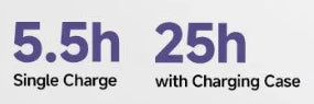 Autonomie de la batterie : 5,5h (écouteur), 25h avec étui de chargement